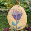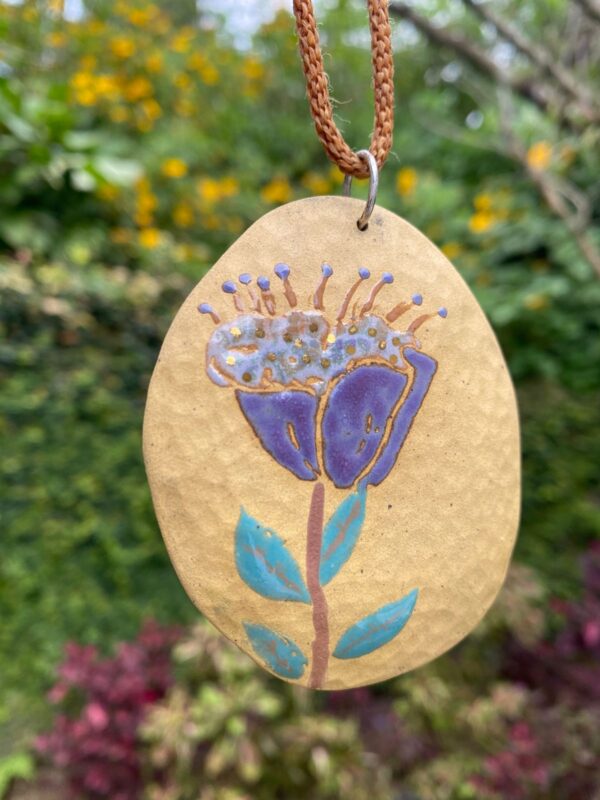 Este colar é feito à mão, com cerâmica esmaltada em alta temperatura, detalhes em ouro 18k, metal de prata 925 e cordão de ponto peruano de poliéster encerado.