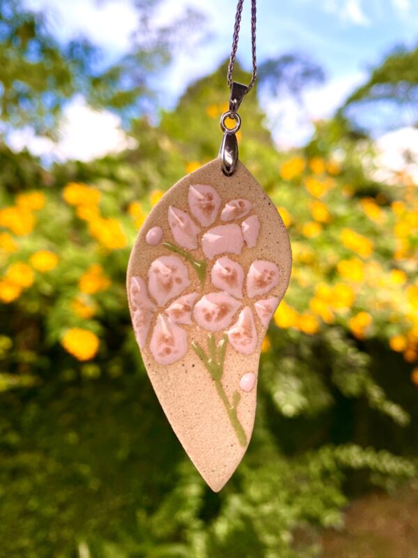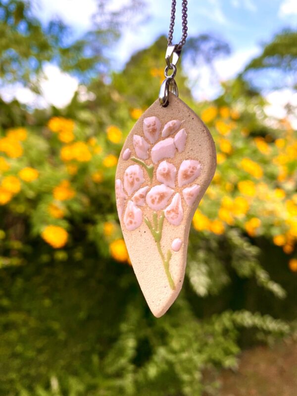 Colar feito de cerâmica esmaltada em alta temperatura, corrente de prata 925 e metal banhado à ouro branco.