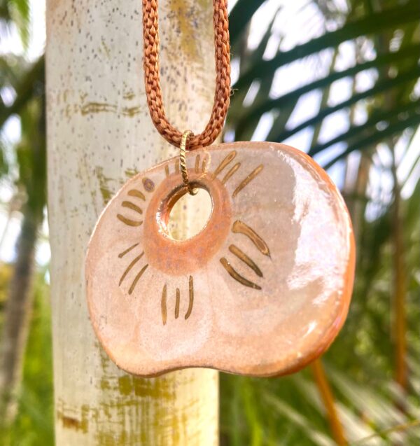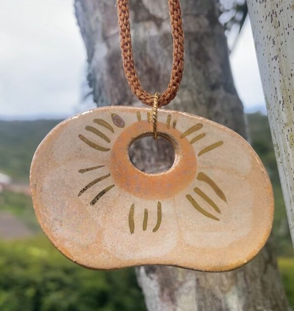 Colar feito em cerâmica esmaltada em alta temperatura, detalhe em ouro 18k, cordão ponto peruano feito de fio de poliester encerado, metal banhado a ouro.
